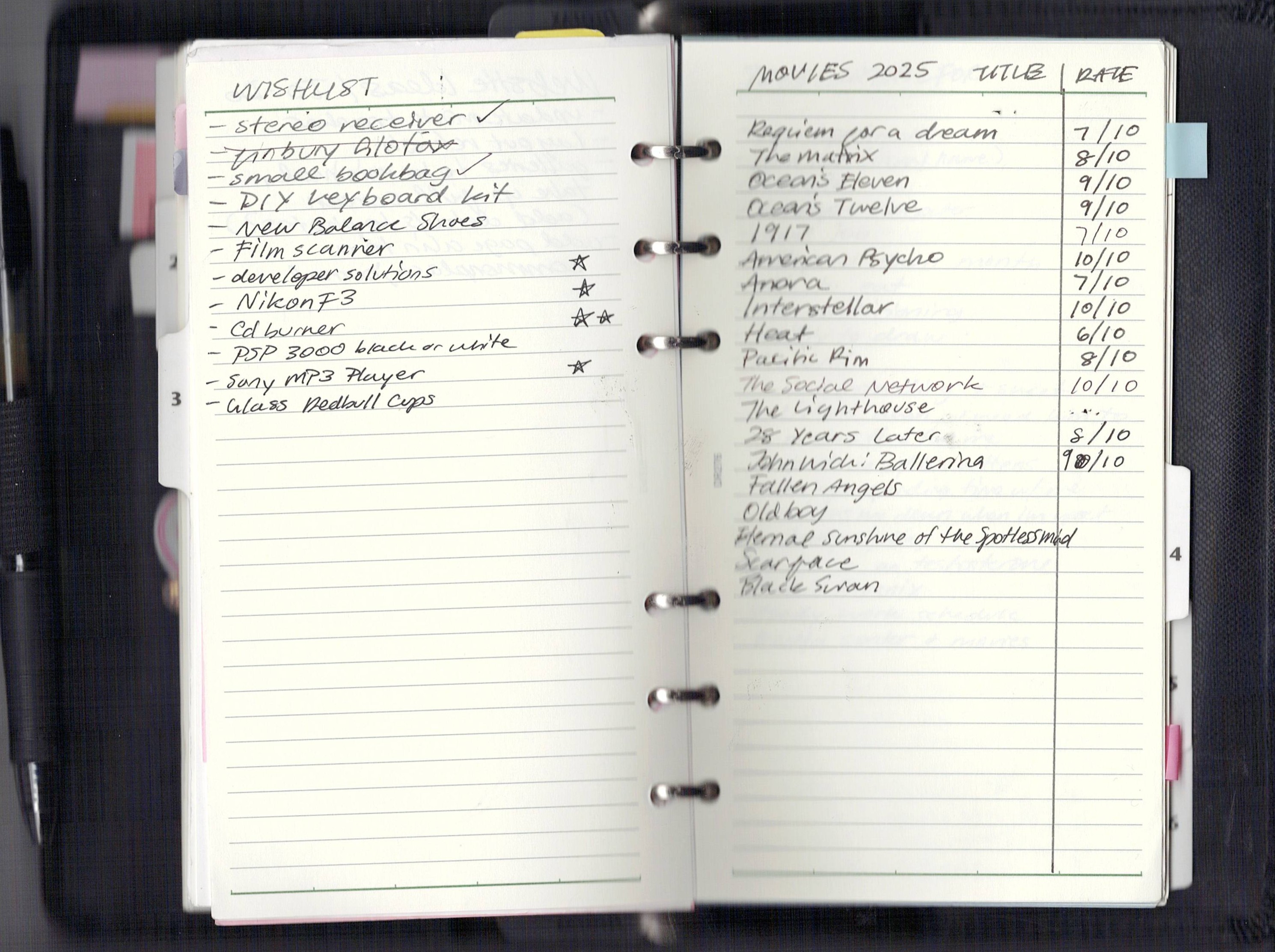 next up is my filofax. i own a personal size compact saffiano [link]. i used to use this a planner, but 2026 i plan to switch back to a hobonichi weeks for my planning. i had different sections during my use: first tab as the monthly calendars, second tab my weekly view for writing down day to day tasks, third tab for notes and other important information, and fourth tab as a mini journal when this was all i carried and didn't have my actual journal with me. liked it but i found i preferred a bound notebook in the end. don't have much ideas for this one anymore and am unsure on what to do with it unfortunately...